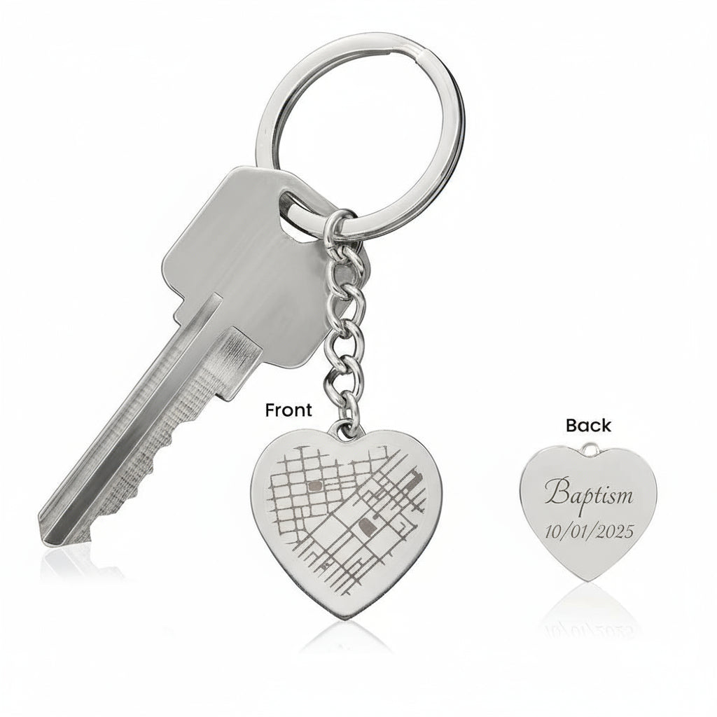 This beautiful heart-shaped keychain is more than just an accessory—it's a meaningful reminder of the special moments in your spiritual walk. Use the map feature to mark a location that holds deep significance in your faith journey, such as: